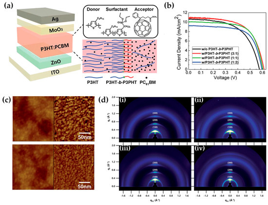 Amphiphilic block copolymer-based CBs. (a) Addition of P3HT-b-P3PHT block copolymers into the P3HT:PC61BM film and diffusion at the P3HT:PC61BM interface. (b) Comparison of the J-V curves of the P3HT:PC61BM control device and the P3HT:PC61BM device blended with 5 wt.% P3HT-b-P3PHT diblock copolymers. (c) AFM topography (left) and phase images (right) of the (i) P3HT:PC61BM; (ii) P3HT:PC61BM blended with 5 wt.% P3HT-b-P3PHT (3:1). (d) GIWAXS characterization of (i) P3HT:PC61BM, and P3HT:PCBM blended with (ii) P3HT-b-P3PHT BCP (3:1), (iii) P3HT-b-P3PHT (1:1), and (iv) P3HT-b-P3PHT (1:2) thin films. Reproduced from Reference [139], with permission from the Royal Society of Chemistry.
