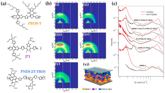 J71 as CB in all-polymer solar cells. (a) Chemical structures of PBDB-T (donor), J71 (CB), and PNDI-2TTR (acceptor). (b) GIWAXS characterization of (i) PBDB-T:PNDI-2T-TR(5), (ii) PBDB-T:10% J71:PNDI-2T-TR(5), (iii) J71:PNDI-2TTR(5), (iv) PNDI-2T-TR(5), and (v) PBDB-T; (vi) pictorial representation of J71 localization into the PBDB-T:PNDI-2TTR film. (c) In-plane and out-of-plane line extracts from the GIWAXS patterns reported in (b). Reproduced with permission from Reference [146]. Copyright 2019 American Chemical Society.
