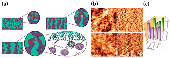 In the work from Lei and colleagues, benzo[1,2-b:4,5-b′]dithiophene1,1,5,5-tetraoxide (BDTO) is originally used as a starting core for the production of two polymer materials, namely PBDTO and PBDTO-T, where the latter is the oxidized (and electron-poorer) modification of the first one [144]. When employed as compatibilizers for the PBDB-T:IT-M blend, the smoothing role played by CBs at the interface, combined with a doping effect and high charge mobility, allows for an increase in the PCE value from 10.31%, yielded by the benchmark PBDB-T:IT-M device, to 11.12% and 11.47%, when using PBDTO and PBDTO-T, respectively. Benzothiophenes are a recurrent core for other compatibilizers, such as PBDB-T [145]; energy levels derived by optical spectroscopy suggest its employ as compatibilizer for dimalononitrile polymer DRCN5T and fullerene acceptor PCBM. The CB improves DRCN5T miscibility and enhances the crystallinity, acting as a good morphology and performance modulator. With the highest doping addition of 20%, PCE rises from 7.74% to 9.45%, Jsc from 14.06 to 15.98 mA/cm2, and FF from 58.56% to 65.72%. Ultimately, 20% is a sensibly high ratio, which is the reason why here the definition of PBDB-T as compatibilizer is very weak, and probably it would be more honest to define those devices as examples of ternary OSCs. Better performances are offered by a different member of the family of benzothiophenes-polymers, namely J71. In the example [146], 10 wt.% addition of J71 to the PBDB-T:PNDI-2T-TR(5) blend leads to Voc = 0.88 V, Jsc = 14.63 mA/cm2, FF = 71.05% and PCE = 9.05%. The study evidences, once more, the morphological implication of such CB in the modulation of the mixing interface and the facilitation of electron transfer phenomena. In order to prove these speculations, it is important to consider the change in the glass transition temperature (Tg); using the Fox equation, the authors initially hypothesize the desired miscibility between PBDB-T and J71, which is lately confirmed by dynamic mechanical analysis (DMA) data and differential scanning calorimetry (DSC); a combination of TEM and AFM images confirms it, as well the reduced dimension of the phase domain size (Figure 7).