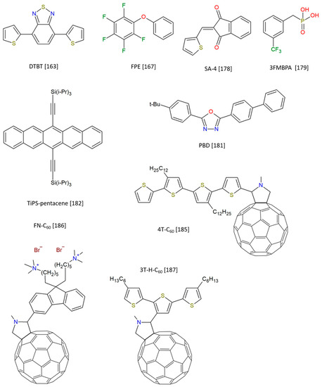 Small aromatic molecules are also designed not specifically for improving the D/A-I, but with the aim of enhancing the interfacial properties between electrodes and photoactive materials. Two very recent papers describe the positive effect due to the addition of relatively small and structurally simple polar aromatic compounds. In the first example, a fluorinated benzylphosphonic acid (3FMBPA) is designed as compatibilizer between the photoactive blend and the ZnO layer [179]. The article reports higher PCE in presence of the CB-molecules. In order to rationalize the results, a deep morphological characterization is performed with STEM-EDX measurements revealing that the CB is mostly localized at the ZnO:BHJ interface, while GIXRD patterns and HR-SEM images reveal high quality crystalline ZnO layer formation after its deposition. The authors suggest that the evidences are in favor of a migration of 3FMBPA, which localizes at the top of the film surface, ending in the formation of a dense passivating layer, able to reduce interfacial energy and efficiently work as trap-suppressor. Moreover, the high crystallinity of ZnO suggests that the CB acts as a nucleating agent during the atomic layer deposition process. O-defects present in the ZnO layer are suppressed by Ou et al. recurring to a benzoylthiourea [180]; in their hypothesis, formation of N-Zn bonding and the resulting reduced oxygen vacancies (as revealed by X-ray photoelectron spectroscopic, XPS) passivate O-defects. The hydrophobic nature of the CB molecule has a secondary beneficial effect, depressing the absorption of external agents such as moisture within the layer. A better charge transport ability is also achieved by means of an oxadiazole-based electron-transporting material, PBD, placed between the ZnO ETL and the photoactive layer [181]. Consequently, PCE increases from 10.8% to 11.6%, due to the simultaneous enhancement in Jsc and FF.