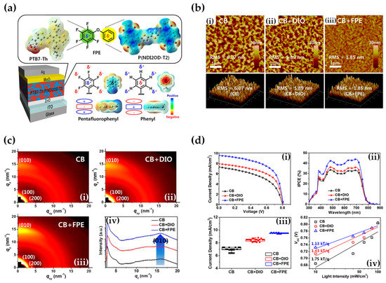 Pentafluorobenzene-based compatibilizers in all-PSCs. (a) Control of the interfacial morphology between PTB7-Th and P(NDI2OD-T2) blend films via electrostatic interactions with pentafluoro-6-phenoxybenzene (FPE). (b) AFM characterization (height at the top, 3D images at the bottom) of the TB7-Th:P(NDI2OD-T2) blend films processed with (i) CB, (ii) CB + DIO, and (iii) CB + FPE. Note that CB stays here for chlorobenzene, DIO for 1,8-diiodooctane. (c) GIWAXS graphs of PTB7-Th:P(NDI2OD-T2) blend films processed with (i) CB, (ii) CB + DIO, and (iii) CB + FPE; (iv) corresponding GIWAXS out-of-plane patterns for the three cases. (d) Photovoltaic characterization of the devices processed with CB, CB + DIO, and CB + FPE, by reporting the (i) J−V graph, (ii) IPCE spectra, (iii) statistical analysis of JSC, and (iv) the VOC as a function of the light intensity. Reproduced with permission from Reference [167]. Copyright (2017) American Chemical Society.