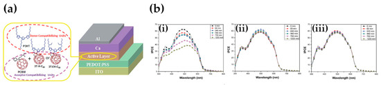 Terthiophene-C60 dyads compatibilizers. (a) Fulleropyrrolidine derivatives bearing π-conjugated terthiophene and two hexyl (H)/ ethylhexyl (EH) chains (3T-H-C60 and 3T-EH-C60) used as a CB of P3HT:PCBM active layers. (b) IPCE spectra of the BHJ solar cells based on (i) P3HT.PCBM, (ii) P3HT:PCBM:3T-H-C60 (1 wt.%), and (iii) P3HT.PCBM:3T-EH-C60 (3 wt.%), after annealing at 130 °C at different times (0–1200 min). Reproduced from Reference [187], with permission from the Royal Society of Chemistry.