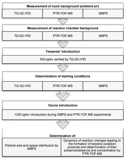 The general scheme of the procedure repeated in each experiment and details regarding ozone and terpenes’ concentrations are presented in Figure 1. The concentrations of reagents subjected to ozonolysis reaction were set empirically, based on the results of preliminary experiments, taking into consideration the repeatability of measurements and the clarity of the results. Each of the experiments carried out was repeated at least three times, and the spread of the results did not exceed 20%. Measurement time was set with reference to a typical residence time of indoor air (the order of 1–2 h [47]), which governed the likelihood that given gaseous and particle constituent-related processes would occur.