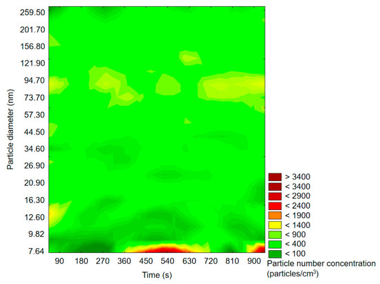 The particle size distribution was rather uniform during the whole measurement. An increase in particle number density at the very bottom of the graph indicated that particles of a diameter smaller than 8 nm were possibly abundant, but the applied device settings did not allow monitoring particles of less than 7.64 nm in diameter. Background measurement showed that the magnitude of the particle number concentration before oxidation experiment was negligible taking into consideration the magnitude of PNDs after oxidant introduction; therefore, the possible interference deriving from background air may be excluded.
