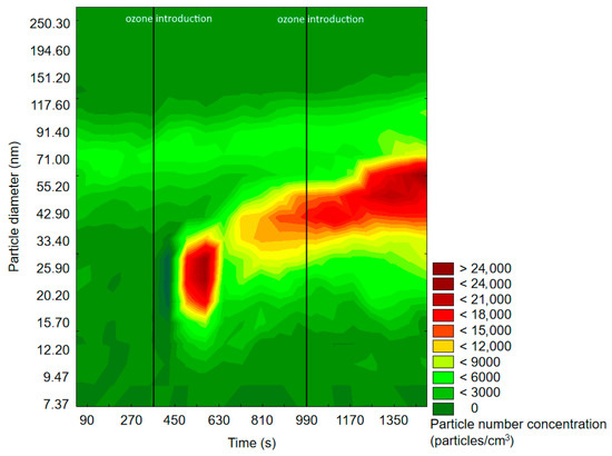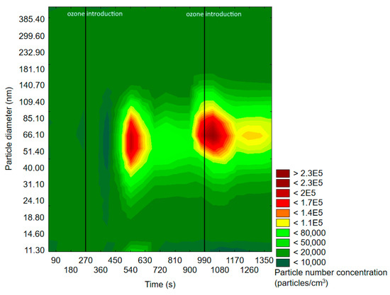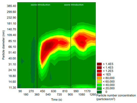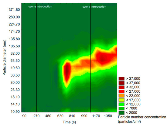 Before ozone introduction, dominant particles were of a diameter in the range of 75–100 nm. In Figure 4 (experiment with d-limonene), there is a longitudinal area of increased PSD formed by particles of 55–117 nm, which was present throughout the whole experiment, therefore not related to oxidation processes. In both cases, the effects of ozone introduction were comparable: first, it initiated the burst of fine particles of a diameter <50 nm, which was followed by rapid PND increase and a shift of the maximum concentration towards particles of diameters greater than 60 nm. A similar trend was observable after subsequent ozone introduction. The first ozone introduction induced the formation of new particles, which further nucleated and grew with time into larger particles. Subsequent ozone addition resulted in both homogenous nucleation and coagulation onto already existing particles. In the case of d-limonene oxidation, after the second ozone introduction, there was a constant PND increase by the end of the measurement, which was not observed in the experiment with α-pinene. A visible difference in the course of the formation of ultrafine SOA particles in the case of α-pinene and d-limonene ozonolysis was possibly related to the difference in particle number concentration, which strongly influenced the aerosol condensation sink.