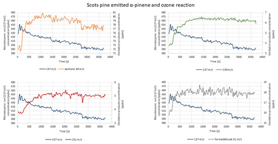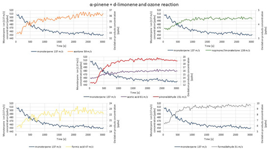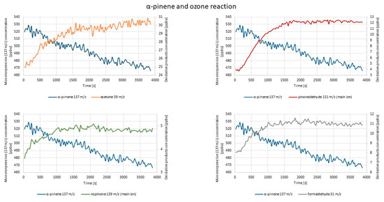 Figure 6 represents exemplary results obtained during the measurement of the concentrations of the monitored compounds after α-pinene and ozone were introduced into the reaction chamber.