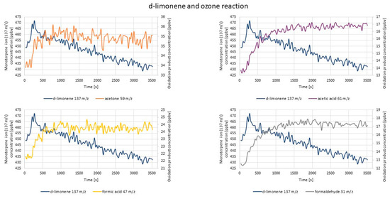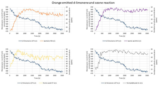 - d-limonene oxidation products: acetone (59 m/z); formaldehyde (31 m/z); formic acid (47 m/z); C3H6O2 (75 m/z); limonaketone (139 m/z); C9H14O2 (155 m/z); limononaldehyde (169 m/z); acetic acid (61 m/z); acetaldehyde (45 m/z) [66].
