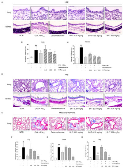 After sacrifice, lung and trachea tissues were collected. Hematoxylin and eosin (H&E), Periodic Acid-Schiff (PAS) and Masson′s trichrome staining were performed to evaluate airway remodeling in lung and trachea tissues. Lung and trachea tissues were stained with H&E for evaluating infiltration of inflammatory cells followed thickness of epithelium. The OVA + PM group showed that thickness of epithelium was increased by infiltrating inflammatory cells compared with the normal saline (NOR) group. Treatment with dexamethasone reduced 23.17% and 58.9% in thickness of the pulmonary and tracheal epithelium of lung and trachea tissues, respectively. As shown in Figure 1A and B, epithelial thickness of the lung decreased by 31.32% in the BHT 629 group. Similarly, administration of 6.29 mg/kg, 62.9 mg/kg and 629 mg/kg of BHT attenuated epithelial thickness by 40.08%, 52.57% and 60.47% in trachea tissues (Figure 1A,C).