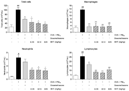 2.2. Effects of BHT on Inflammatory Cells in Bronchoalveolar Lavage Fluid (BALF) of OVA and PM10-Induced Mice