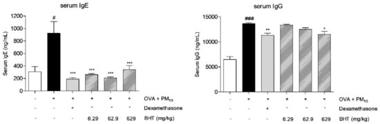 2.3. Effects of BHT on Secretion of Serum Immunoglobulin Levels in OVA and PM10-Induced Mice