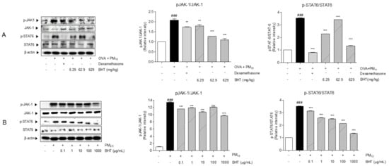 We measured protein levels of JAK1 and STAT6 in OVA + PM10-induced mice model by western blot. The protein expression tendency of phosphorylated JAK1 and STAT6 in the OVA + PM group significantly increased, by 2.08 folds and 3.5 folds, compared with the NOR group. BHT treatment suppressed levels of phosphorylated JAK1 about 13.89%, 38.83%, 47.19% compared with the OVA + PM treatment. Administration of BHT 629 mg/kg inhibited expression of the factor that promotes production of inflammatory cytokine, phosphorylated STAT6 by 62.57%, compared to the OVA + PM group (Figure 4A).