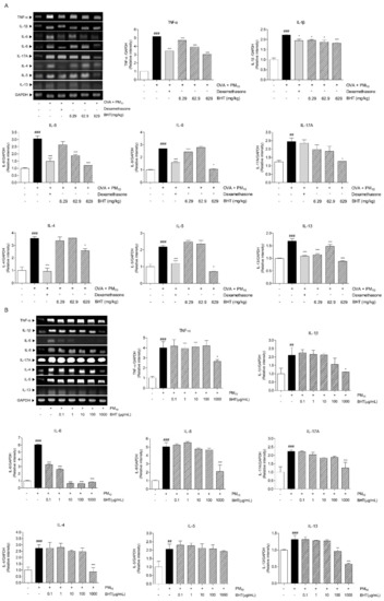 To determine inhibitory effects of BHT in airway inflammation, we investigated expression levels of pro-inflammatory cytokines, TNF-α, IL-1β, IL-6, IL-8 and IL-17A, which were analyzed by RT-PCR in OVA + PM10-induced mice. The levels of each pro-inflammatory cytokine were up-regulated about 5.2 folds, 2.2 folds, 3.1 folds, 2.7 folds and 1.7 folds in the OVA + PM group compared with the NOR group. Dexamethasone treatment significantly reduced levels of TNF-α, IL-1β, IL-6 and IL-8. Following treatment of BHT 629 mg/kg showed a significant decrease in levels of TNF-α, IL-1β, IL-6, IL-8 and IL-17A by 41.57%, 18.24%, 60.64%, 60.8% and 81.34% in dose-dependent manner. Th2-related cytokines, including IL-4, IL-5 and IL-13, were analyzed by RT-PCR in the same manner. The expression levels of each Th2-related cytokine were up-regulated by 3.6 folds, 2.2 folds and 1.7 folds in the OVA + PM group compared with the NOR group. Treatment with dexamethasone significantly inhibited production of Th2-related cytokines by 73.15%, 45.73% and 35.47%. Compared with the OVA + PM group, administration of BHT 629 suppressed levels of IL-4, IL-5 and IL-13 by about 27.57%, 67.57% and 47.75% (Figure 5A).