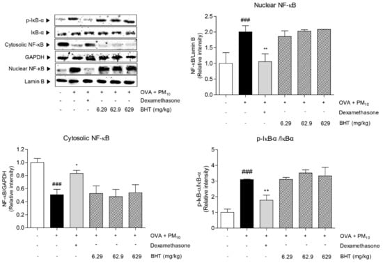 We determined the effects of BHT on nuclear factor-kappa B (NF-κB) signal pathway in OVA + PM-induced mice by measuring level of NF-κB in nucleus and cytosol and inhibitor of nuclear factor-kappa B alpha (IκB-α) in cytosol. As shown in Figure 6, the expression level of NF-κB in nucleus was increased by 100.4% in the OVA + PM group compared with the NOR group. By contrast, the protein level of NF-κB in cytosol decreased by 49.35%. As the chain of NF-κB activation, expression protein level of phosphorylated IκB-α was elevated in the OVA + PM group by 3 folds compared with the NOR group. Treatment with dexamethasone significantly reduced expression levels of NF-κB activity. However, BHT treatment did not reach significance compared to OVA + PM group.