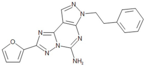 5-Amino-7-(2-phenylethyl)-2-(2-furyl)-pyrazolo(4,3-e)-1,2,4-triazolo(1,5-c) pyrimidine (SCH 58261) is classified as an adenosine A2A receptor antagonist [6,7,16,17,18,19] (Figure 1). The non-xanthine heterocyclic compound SCH 58261 is a new, potent and selective A2A adenosine receptor antagonist [18]. This drug particularly binds to the A2A receptor, among the various adenosine receptor subtypes [18,19]. It is known that SCH 58261 is potent against cAMP production as well as binding [17,18,20]. SCH 58261 is one of the new chemical entities that has been developed as an adenosine A2A receptor antagonist. Since then, SCH 58261 has been widely used as a reference drug in the development of adenosine A2A receptor antagonists in many articles [21,22,23,24,25]. However, although SCH 58261 has been reported to be beneficial, there is little information about SCH 58261 in terms of its absorption, distribution, metabolism, and excretion (ADME) as well as its pharmacokinetics (PK) perspectives in animals and humans.