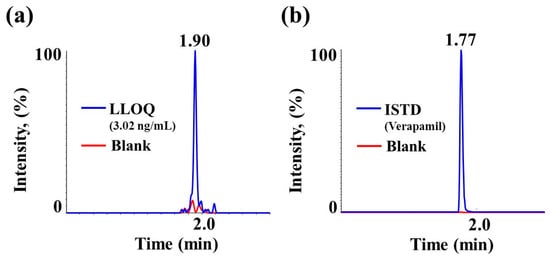 Representative chromatogram of (a) lower limits of quantification (LLOQ) (3.02 ng/mL) for SCH 58261 and (b) internal standard (ISTD) (verapamil) with blank matrix in rat plasma.