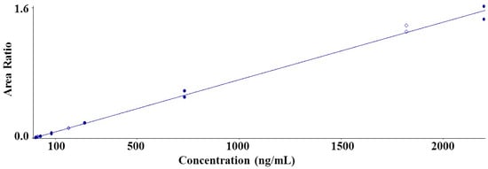 The calibration curve range was 3.02~2200 ng/mL. The run contained duplicate calibration curve standards (STD) at seven concentrations, quality control (QC) samples at three concentrations, and two blank samples. All calibration curves were well established using a weighted quadratic regression: 1/concentration2 (Figure 3). The correlation coefficient for evaluating the linearity of the calibration curve was ≥0.99 for SCH 58261.