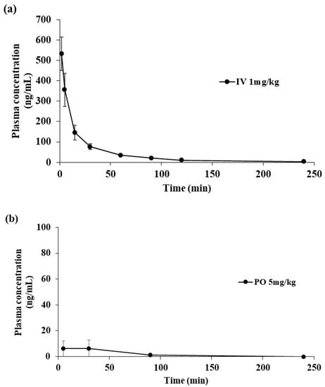 All animal studies were performed in accordance with the “Guidelines in Use of Animal” established by the Chungnam National University Institutional Animal Care and Use Committee (Daejeon, Korea). This study was approved by the Chungnam National University Institutional Animal Care and Use Committee (No. CNU-01104). Male SD rats (8 weeks old; Samtako Biokorea, Gyeong-gi, Korea), 280–300 g, were used for the pharmacokinetic study. For the PK study, two groups of cannulated rats were administered a single 1 mg/kg intravenous dose and a single 5 mg/kg oral dose of SCH 58261. Blood samples were collected at 2, 5, 15, 30, 60, 90, 120, and 240 min following drug administration in the intravenous group (n = 3). Blood samples were collected 5, 30, 90 and 240 min for oral doses (n = 2). After centrifugation at 10,000 rpm for 5 min, plasma was transferred to Eppendorf tubes and stored at −20 °C until analysis. After sample preparation, the PK samples were analyzed by LC–MS/MS.