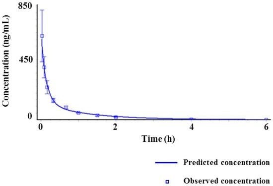 The in silico tool was used to determine which factors were significantly involved in poor drug exposure after oral administration of SCH 58261. In this study, GastroPlus™ was used to predict the PK characteristics of SCH 58261 [29]. GastroPlus™ is a tool to simulate the PK of drugs in virtual humans and animals based on in vitro and in vivo ADME/PK parameters. Parameter sensitivity analysis (PSA) is one of the built-in modules of GastroPlus™ and is also very useful to explore which PK parameters would be significant contributors to drug exposure in vivo after oral administration [30,31,32]. The following figure shows a typical simulated two-compartment model PK profile of SCH 58261 after IV administration (Figure 5).