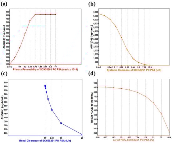 The PSA was conducted to examine the factors that significantly affect the drug exposure after oral administration of SCH 58261 in rats. A total of seven ADME/PK parameters were used to simulate the drug exposure: permeability, solubility, systemic clearance, renal clearance, liver first-pass effect (FPE), blood–plasma ratio, and unbound fraction. Eventually, these ADME/PK parameters were combined and further categorized into four PSA factors, including permeability, systemic clearance, renal clearance, and liver FPE%. Figure 6 shows the PSA results of SCH 58261.