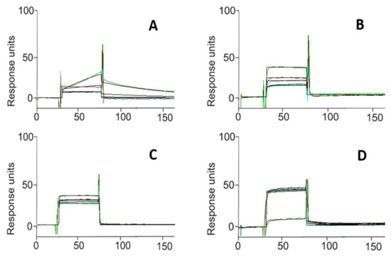 Surface plasmon resonance sensorgrams acquired for HAA2020 (A), 4 (B), 5 (C) interacting with Hsp90α and for the positive control 17-AAG (D). Each compound was injected onto an Hsp90α modified sensor chip at 6 (n = 3) different concentrations in the range 0.025–4.000 μM.