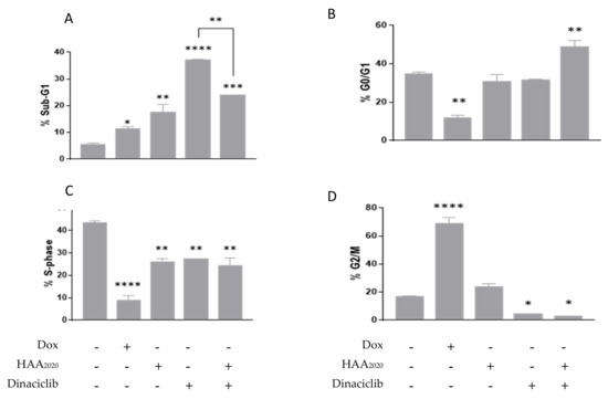 The pan CDK inhibitor dinaciclib was selected as a candidate for further investigations with HAA2020 because it showed the best CI between the eleven inhibitors. The cell cycle distribution was used to examine the anti-proliferative effect of the HAA2020 and dinaciclib combination. Following a 24 h treatment, HAA2020 and dinaciclib (500 nM and 10 nM, respectively) elicited an increase in the sub-G1 phase in HL60 cells, and stronger than that observed for doxorubicin alone as a positive control (100 nM), with the highest increase attributed to dinaciclib. Moreover, the combination treatment showed a significant increase in the sub-G1 phase, but less than the effect caused by each of them alone (Figure 4A). Neither HAA2020 nor dinaciclib had an effect on the G0/G1 phase, however, their combination elicited a significant cell cycle arrest, as observed by an increase of cells in the G0/G1 phase (Figure 4B). However, this was not the case with the addition of doxorubicin, as an opposite observation was apparent, where G0/G1 was reduced. When comparing the differences in the S phase, all three compounds showed significant decreases compared with the untreated control, with the highest decrease attributed to doxorubicin, and little difference between either HAA2020, dinaciclib or their combination (Figure 4C). HAA2020 had no significant effect on the G2/M phase of the cell cycle, in contrast to dinaciclib, where G2/M was significantly reduced both alone or in combination with HAA2020 (Figure 4D). Furthermore, doxorubicin significantly increased cells in the G2/M phase.