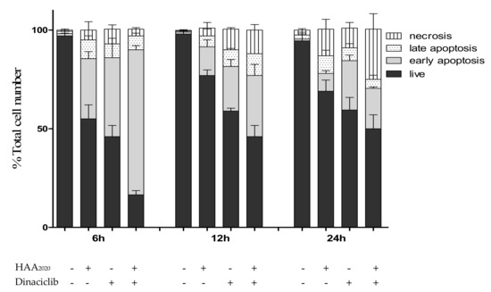 Detection of apoptosis in HL60 cells. Cells were treated for 6 h, 12 h and 24 h with either HAA2020 (500 nM), dinaciclib (10 nM) or their combination. Following treatment, the cells were stained with annexin V FITC/PI. A total of 20,000 single-cell events were acquired on a BC-500 flow cytometer and analyzed by the Expo 32 software. Data are represented as mean ± SEM (n = 3, two independent experiments) for each of the cell staining statuses: live cells (annexin V-/PI-), early apoptotic cells (annexin V+/PI-), late apoptotic cells (annexin V+/PI+) and necrotic cells (annexin V-/PI+).