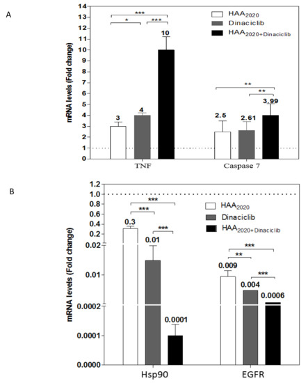 For more details on the apoptotic process of the tested compounds, the mRNA amount of TNF and the caspase-7 genes were evaluated by real-time PCR, following the treatment of HL60 cells at 6 h with either HAA2020 (500 nM), dinaciclib (10 nM) or their combination. Each of the two compounds significantly upregulated the TNF-α and caspase-7 genes in addition to their combination, which showed a synergistic effect, suggesting involvement of both the extrinsic and intrinsic apoptotic pathways. A similar significant effect was exhibited against Hsp90α and its client protein EGFR, but in the decreasing mode, which indicates that the main activities of HAA2020 are maintained when it is combined to the CDK inhibitor dinaciclib (Figure 6).