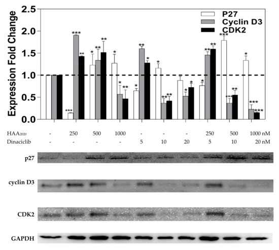 Western blotting was devised to study the effect of HAA2020 and dinaciclib (6 h) on the G1/S cell cycle check point regulatory proteins p27, cyclinD3 and CDK2. The HL60 cells were treated with HAA2020 (250 nM, 500 nM and 1000 nM), dinaciclib (5 nM, 10 nM and 20 nM) and their combination for 6 h. HAA2020 caused a dose-dependent increase in the p27 expression compared with the control GAPDH, while dinaciclib alone, or combined with HAA2020, caused an irregular increase in p27. Each of HAA2020, dinaciclib and their combinations caused a dose-dependent inhibition of cyclin D3 compared with the control, which was more pronounced by the combination. Most importantly, HAA2020 significantly reduced CDK2 at 1000 nM, while dinaciclib caused more inhibition at its IC50 (i.e., 10 nM). The combination of the two compounds caused a dose-dependent and significant decrease in CDK2 compared with GAPDH (Figure 7).