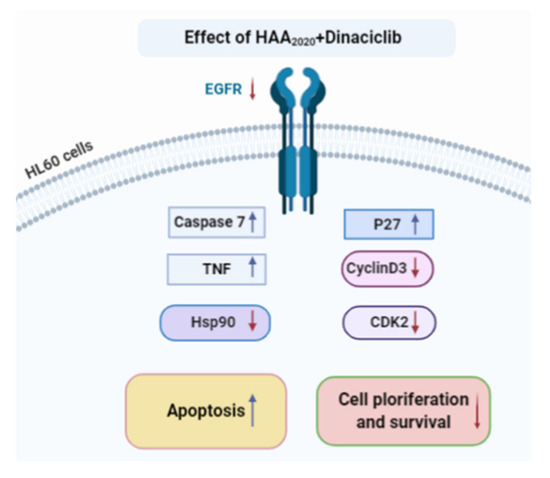 The effect of the HAA2020 and dinaciclib combination on apoptosis, cell proliferation and survival of HL60 cells. Created in BioRender.com.