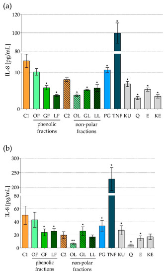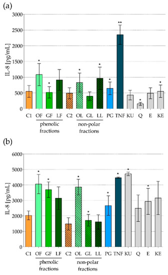 IL-8 production by human foreskin fibroblasts line HFF-1 exposed to fractionated E. rhamnoides (L.) extracts and reference compounds: (a) 6 h; (b) 24 h, tested by ELISA. The results are given as a mean concentration [pg/mL] ± standard error. C1—control cells in culture medium with Me-OH, OF/GF/LF—phenolic fractions of fruit/twig/leaf extracts, C2—control cells in culture medium with DMSO, OL/GL/LL—non-polar fractions of fruit/twig/leaf extracts, PG—S. aureus peptidoglycan, TNF—murine tumor necrosis factor alpha, KU—ursolic acid, Q—quercetin, E—(−)-epicatechin, KE—ellagic acid; * p < 0.05, ** p < 0.01.
