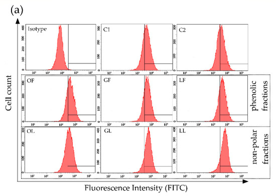 Caco-2 in the exponential growth phase were seeded (2.5 × 105/well) on 24-well plates and cultured for 24 h at 37 °C in a humidified atmosphere of 5% CO2. Then, the standard culture medium was replaced with fresh medium containing 1.25% v/v Me-OH/DMSO (control cells C1/C2, respectively) or medium supplemented with tested extracts (100 µg/mL), reference compounds (E, KE, Q, KU; 100 µg/mL), PG (1 µg/mL) or TNF (500 ng/mL) and cells were cultured for 24 h at 37 °C in a humidified atmosphere of 5% CO2. After 24 h the culture medium was removed and the monolayer was gently washed twice with sterile DPBS and cells were detached with 15 mM EDTA/0.5% BSA solution in DPBS (10 min, on ice). The free-cell suspensions were transferred to eppendorf tubes and centrifuged (5 min, 2000 rpm, 4 °C). Obtained cell pellets were resuspended in 150 µL of staining buffer (0.5% BSA/0.1% sodium azide in DPBS) and then 50 µL aliquots were transferred to cytometric tubes, where previously 3 µL of antibodies (anti-CD49f/PE and anti-ICAM-1/FITC or anti-CD49f/PE and IgG1/FITC) were added. All samples were incubated on ice, in a dark for 30 min, washed twice with staining buffer and finally resuspended in the same buffer. Immediately all samples were measured on BD LSRII flow cytometer (Becton Dickinson, Franklin Lakes, NJ, USA) and analyzed with BD FACSDIVA software (Becton Dickinson, Franklin Lakes, NJ, USA). The expression of ICAM-1 on Caco-2 surface was measured on CD49f-positive cells (104 cells/sample) from population of singlet cells (FSC-A vs. FSC-H analysis). The marker of FITC fluorescence was setup based on isotype control staining. The scheme of gating strategy is presented in Figure 2a.