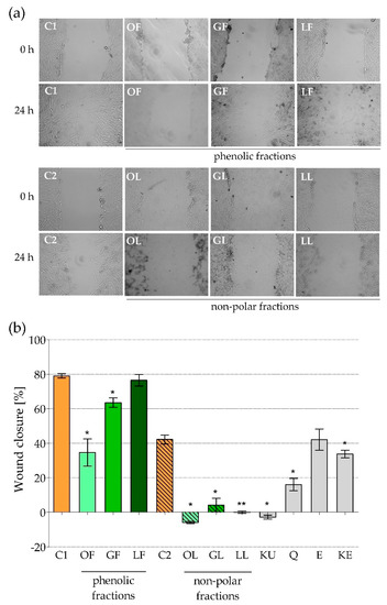Human foreskin fibroblasts line HFF-1 migration after 24-h exposure to fractionated E. rhamnoides (L.) extracts and reference compounds, tested by scratch assay: (a) Representative pictures of the scars just after scratch (t0) and after 24 h cells exposure (t24), magnification 100×; (b) “wounds” closure given as a mean percentage ± standard error calculated based on scars area at t0 and t24. C1—control cells in culture medium with Me-OH, OF/GF/LF—phenolic fractions of fruit/twig/leaf extracts, C2—control cells in culture medium with DMSO, OL/GL/LL—non-polar fractions of fruit/twig/leaf extracts, KU—ursolic acid, Q—quercetin, E—(−)-epicatechin, KE—ellagic acid; * p < 0.05, ** p < 0.01.