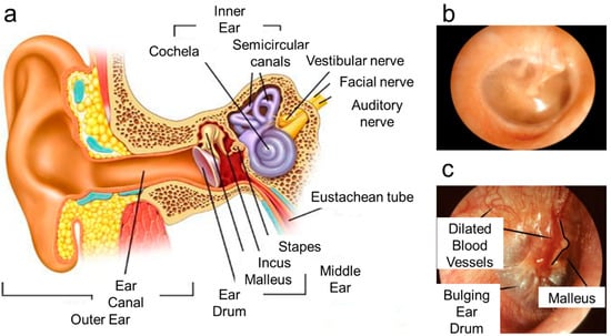 Although most infections are a result of bacterial invasion, there are a few ear infections such as vestibular neuronitis, infectious myringitis, and herpes zoster of the ear, which are caused by viruses. Vestibular neuritis is caused by the inflammation of the vestibular nerve, which is situated at the inner ear (Figure 1a). Acute mastoiditis is a type of bacterial infection resulting from untreated acute otitis media, prompting serious exertion and intrusion of the mastoid cells in the mastoid bone located behind the ear []. As seen from Figure 1b, the eardrum of a healthy ear looks pinkish gray, whereas the otitis media infected middle ear in Figure 1c has a red, bulging eardrum.