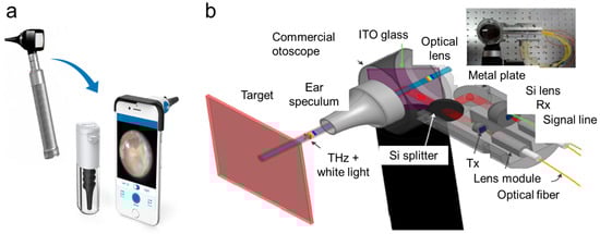 Clinically, an otoscope is the most widely used device by an otolaryngologist for identification of problems associated with ear pain. The key parameters examined in the middle ear include coloration, transparency, and the presence of liquid in the tympanic membrane []. In most cases, patients are advised oral or topical antibiotics; although being sufficient for pain, the infection recurs due to the evolution of antimicrobial-resistant bacteria. It has been found that the frequent use of antibiotics and bacterial biofilms can help to increase antimicrobial resistance [,]. Recently, Yang et al. developed an antibiotic-encapsulated hydrogel with chemical permeation enhancers to improve the drug efficiency and antimicrobial therapy of the hydrogel, when applied to the tympanic membrane through the external auditory canal of the ear. The formulated hydrogel successfully eradicated AOM from the Haemophilus influenzae bacteria in a chinchilla model []. A single dosage of such drugs would cover a complete antibiotic course, improving patient compliance, avoiding antibiotic over-dosage, and ultimately reducing recurrent side effects. Figure 2a (left) shows a typical otoscope, and Figure 2a (right) shows an iPhone-enabled otoscope (Cell Scope). Monroy et al. mentioned that an otoscope showed approximately 70% sensitivity and specificity for diagnosis of otitis media []. Although both the otoscope and CellScope are useful tools, visual inspection alone may not be sufficient to detect the specific type of infection, in more severe cases. AOM is associated with inflammatory changes, such as variations in the mucous membrane, accumulation of liquid, and pus. Some visual observation can be made with the otoscope; however, any chemical changes or identification of bacterial phenotype are not possible with a conventional otoscope. Ji et al. designed and constructed a terahertz (THz) otoscope, which works on THz technology or in other words electromagnetic waves to detect water molecules sensitively for feasible AOM diagnosis. The detection of electromagnetic waves enabled by the terahertz technology is helpful for obtaining precise ear membrane information. Figure 2b shows the schematics of a THz otoscope, which is integrated with a conventional optical otoscope with a fiber-coupled THz module. It was interesting to see that this device can be used as both a THz otoscope, as well as a conventional otoscope. While THz technology has been used in several biomedical applications, this technology helps the physician diagnose AOM as well. From their results, it was evident that it was possible to identify the presence of water located at the membrane and sample interface with respect to different types of THz pulses regulated by membrane thickness and separate refractive indices [].