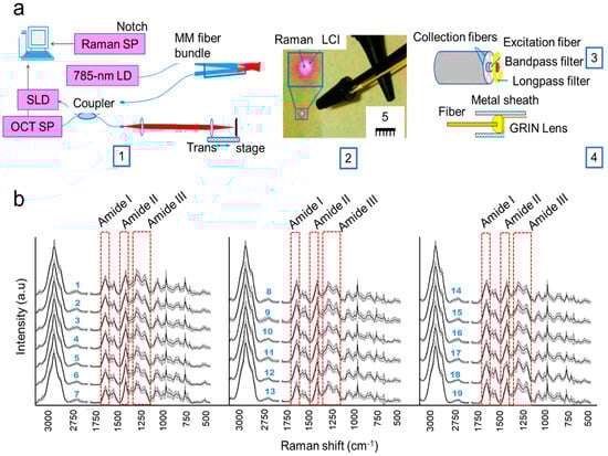 (a) Raman and low-coherence interferometry (Raman LCI) ((gradient index (GRIN); spectrometer (SP); laser diode (LD); superluminescence diode (SLD); multimode (MM)). Reproduced with permission from []. (b) Mean Raman spectra of common bacteria of ear infection. 1: Listeria grayi, 2: Listeria innocua, 3: Listeria monocytogenes, 4: Listeria welshimeri, 5: Staphylococcus aureus, 6: Staphylococcus cohnii, 7: Staphylococcus epidermidis, 8: Escherichia coli, 9: Pseudomonas aeruginosa, 10: Pseudomonas putida, 11: Pseudomonas stutzeri, 12: Salmonella enterica, 13: Salmonella typhimurium, 14: Yersinia aldovae, 15: Yersinia bercovieri, 16: Yersinia enterocolitica, 17: Yersinia mollaretii, 18: Yersinia rohdei, 19: Yersinia ruckeri. Adopted and modified with permission from []. Copyright Elsevier Ltd., 2013.