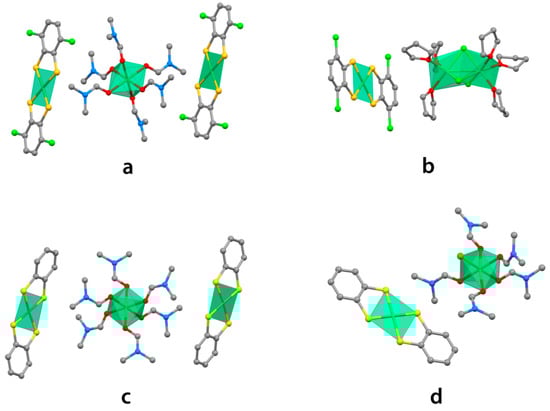 Ionic species per formula unit found in the dithiolene derivatives: a, [Ni(DMF)6][Ni(SC6H2Cl2S)2]2 1; b, [Ni2(µ-Cl3)(THF)6][Ni(SC6H2Cl2S)2] 4; c, [Ni(DMF)6][Ni(SC6H4S)2]2 5; and d, [Ni(DMF)5Cl][Ni(SC6H4S)2] 6. Green octahedra and square planar geometries represent Ni coordination environments. Oxygen atoms are depicted in red, sulfur ones in yellow, nitrogen in blue, chlorine in light green, and carbon in grey. Solvent molecules and hydrogen atoms have been omitted for clarity.