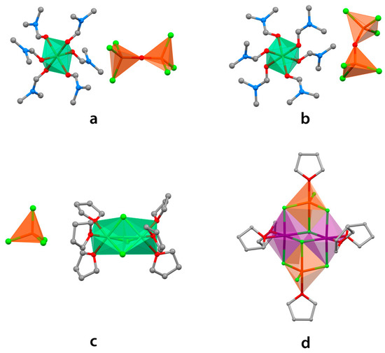 Molecular species per formula unit in the compounds containing both Fe and Ni metals: a, [Ni(DMF)6][Fe2(µ-O)Cl6] 2A; b, [Ni(DMF)6][Fe2(µ-O)Cl6] 2B; c, [Ni2(µ-Cl)3(THF)6][FeCl4] 3; d, tetrametallic compound [M4(µ-Cl)8(THF)6] 7; hydrogen atoms have been omitted for clarity. Green octahedra represent Ni coordination environments; orange tetrahedra, Fe environments; and purple octahedra the shared Fe/Ni ones; oxygen atoms are depicted in red, nitrogen in blue, chlorine in light green and carbon in grey.