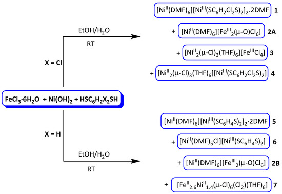 Taking into account these results, we now evaluated whether the Ni(II) cation, that shows high ability to coordinate to sulfur atoms, could act as a linker between the anionic entities [Fe2(SC6H2X2S)4]2− (X = Cl or H) in order to prepare CPs. Herein, we report on the syntheses and crystal structures of the new compounds [Ni(DMF)6][Ni(SC6H2Cl2S)2]2·2DMF (1), [Ni(DMF)6][Fe2(µ-O)Cl6] (2), [Ni2(µ-Cl)3(THF)6][FeCl4] (3), [Ni2(µ-Cl)3(THF)6][Ni(SC6H2Cl2S)2] (4), [Ni(DMF)6][Ni(SC6H4S)2]2·2DMF (5), [Ni(DMF)5Cl][Ni(SC6H4S)2] (6) and [Fe2.6Ni1.4(µ-Cl)8(THF)6] (7) formed in the reactions between FeCl3·6H2O with Ni(OH)2 in the presence of dithiolenes HSRSH (R = C6H2Cl2 or C6H4). It has to be noticed that models obtained from single-crystal X-ray diffraction (SCXRD) data of some heterobimetallic structures cannot properly differentiate between iron and nickel atoms, two metal centers with very similar electron densities. Then, a total reflection X-ray fluorescence (TXRF) analysis on the measured single crystals was successfully applied to calculate the element content and to refine the occupation of the metal positions [21].