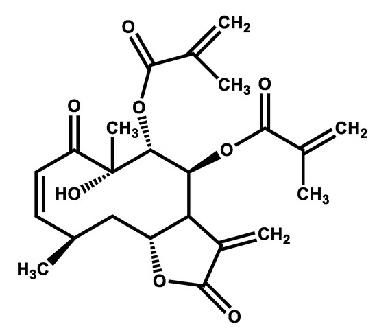 The dichloromethane extract was prepared by macerating plant leaves (6.7 kg), as described by Sánchez-Mendoza et al. [10]. Column chromatography was performed with 300 g of the extract and an elution system based on hexane and mixtures of hexane/dichloromethane in various proportions. White crystals (1.5 g) were obtained from the fractions 80–90 (hexane/dichloromethane, 5:5) and identified as juanislamin (Figure 1) by comparing the 1H- and 13C-NMR spectra to those previously published [20]. Compound CID: 6440536, according IUPAC name: [(3aS,4S,5R,6R,8Z,10R,11aR)-6-hydroxy-6,10-dimethyl-3-methylidene-5-(2-methylprop-2-enoyloxy)-2,7-dioxo-3a,4,5,10,11,11a-hexahydrocyclodeca[b]furan-4-yl] 2-methylprop-2-enoate.