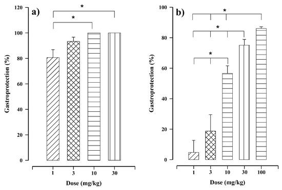 In the rat model of ethanol-induced gastric lesions, distinct levels of gastroprotection resulted from different treatments: (a) juanislamin (1–30 mg/kg) and (b) carbenoxolone (1–100 mg/kg). Bars represent the mean ± SEM (n = 7). * p ≤ 0.05, Kruskal–Wallis test followed by Dunn’s multiple comparison.