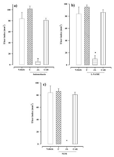 Gastroprotective effect of juanislamin (JA, at 10 mg/kg) and carbenoxolone (CAR, at 100 mg/kg) in rats receiving one of three pretreatments: (a) indomethacin (10 mg/kg), (b) NG-Nitro-l-arginine methyl ester hydrochloride (l-NAME, 70 mg/kg) or (c) N-Ethylmaleimide (NEM, 10 mg/kg). Comparisons were made to the negative control (vehicle + ethanol). C = different inhibitors plus ethanol. Bars represent the mean ± SEM (n = 7). * p ≤ 0.05, Kruskal–Wallis test followed by Dunn’s multiple comparisons.