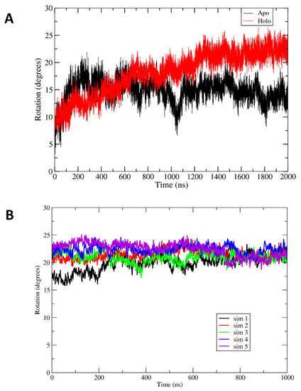 Molecular dynamics analysis used the modeling package GROMACS 5.1 [35,36]. The simulation cell extended 2.0 nm beyond the protein and periodic boundary conditions were applied. The system was neutralized with potassium and chloride ions at concentration 0.1 mol/L. For simulations, the Amber99SB-ILDN force field [37,38,39] was employed. Electrostatics were evaluated using the particle-mesh Ewald method [40] with a cutoff of 1.0 nm; van der Waals forces were evaluated with a Lennard–Jones potential with a 1.0 nm cutoff. Velocity rescale thermostat [41] and Berendsen barostat [42] were employed (coupling constants 0.1 ps), with the protein and solvent atoms in separate baths maintained at 300 K, and pressure maintained at 1 bar with compressibility 4.6 × 10−5/bar. Time steps of 2 fs were used. The solvated system was first energy minimized using steepest descent and the solvent allowed to relax. Initial Boltzmann-weighted velocities were generated randomly, and the system was further equilibrated for 500 ps while keeping the protein restrained. The MD production runs without constraints were carried out up to 2 μs for wildtype protein and to at least 1 μs for the triple mutant, which appeared to stabilize after shorter simulation time. For apoArgR a second independent simulation was initiated and simulated for 500 ns, which replicated the fast rotational shift in the beginning and the attainment of equilibrium after 200 ns (Figure S5). A holoArgR structure, the result of the 2 μs holoArgR simulation, was used to initiate 4 repetitions from conformations observed in the equilibrated phase, and simulated for 1 μs each.