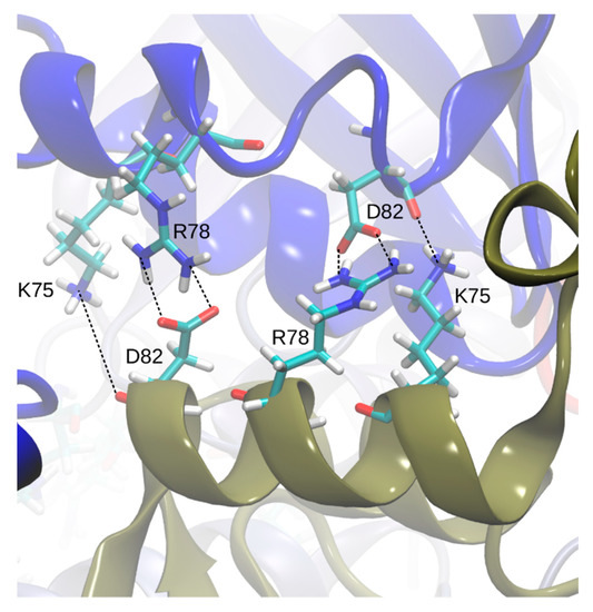 Visual screening of the apo- and holoBsArgR trajectories for potential rotation-driving interactions suggested that the linker-region sequence motif that defines the Bs phylogenetic branch (K75--R78---D82, Table 1) plays a role in the rotational shift. Over the course of both apo- and holoBsArgR trajectories, inter-trimer interactions form between these residues located on helix α4 from a subunit on one trimer and the symmetry-equivalent residues of antiparallel helix α4′ from the closest subunit in the other trimer (Figure 5). The interactions comprise salt bridges between oppositely charged residues that are brought within hydrogen-bonding distance by rotation: Lys75: Nζ with Asp82: Oδ; Lys75: Nζ with Asp82: O; and Arg78 Nη with Asp82: Oδ. In the initial state before any rotation occurs (i.e., at zero time in Figure 4), the sidechain functional groups of these residues are too far apart to be consistent with hydrogen-bond formation, as observed in the apoBsArgR crystal structure from which both protein systems were prepared, even though the distance between their corresponding Cα atoms would permit hydrogen bonding by the extended functional groups of these long sidechains. The unexpected observation that fully charged sidechains within hydrogen-bonding distance do not interact echoes that in apoEcArgRC, where Arg110 and Asp128 sidechains are close enough to form a doubly hydrogen-bonded salt bridge across each empty L-arg binding site, but do not do so [3], which has been suggested to reflect the very high salt concentration during crystallization [13]. In holoBsArgRC (PDB ID: 2P5M) the sidechains of Arg78 and Asp82 are ~3 Å apart and thus can be presumed to interact, although this crystal structure was refined as a trimer, and the hexamer was prepared by a symmetry operation [10].