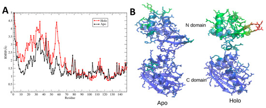 Domain movements upon L-arg binding. (A) RMSF was calculated for all non-hydrogen atoms during the final 500 ns of each simulation and averaged over the six monomers of the hexamer. (B) RMSF calculated for representative monomer F was converted to crystallographic B-factors (see Methods) and colored from lowest (blue) to highest (red).