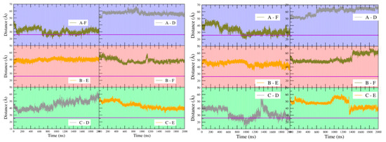 Figure 9 shows that at the beginning of the simulations the distance between Arg43 C-alpha carbons on any pair of subunits is in the range of ~40 to ~50 Å for both apo- and holoBsArgR, consistent with the crystal structure of apoBsArgR from which holoBsArgR was prepared, where the initial distance is ~40 Å. This result shows that the multiple bonding interactions between the N- and C-terminal domains of apoBsArgR (Table 3) position the domains too far apart for DNA binding. The interdomain distances become smaller or larger over time, and with no obvious covariance between domain pairs for either apo- or holoBsArgR. In apoBsArgR the distance approaches ~26 Å occasionally only for monomers A and F (Figure 9 left). This finding suggests that apoBsArgR may be on its way toward a DNA-binding-competent state that would be constitutively active for binding to a single palindrome. In holoBsArgR the distance between Arg43 C-alpha carbons on any pair of subunits approaches ~26 Å for subunit pairs A–F and C–D (Figure 9 right), indicating structures that may be on the way toward binding-competent states for the tandem palindromes of natural Arg operators. In neither apo- nor holoBsArgR is the position of the N-terminal domains fully optimal for DNA binding, however, as helix α3 must also be oriented approximately parallel to the base pair planes in the DNA major groove opening according to known crystal structures. Whole domain movements are expected to be slow (on a μs–ms rather than ns–μs timescale), and on a longer timescale the conformations sampled by holoBsArgR might progress toward DNA-binding-competent states. Whether or not they do so, proximity to a DNA segment bearing suitably spaced palindromic sequences is expected to enforce the distances and orientations required for binding.