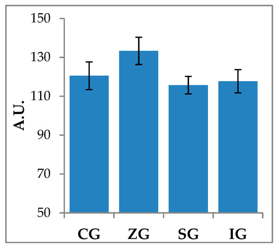Casein-zymography on milk samples obtained from lactating dairy cows fed control diet (CG) and control diet supplemented with zinc (ZG), selenium (SG), and iodine (IG). The ImageJ software was used to perform the quantitative analysis. Data are reported as mean values expressed in arbitrary unit (A.U.) ± standard deviation.