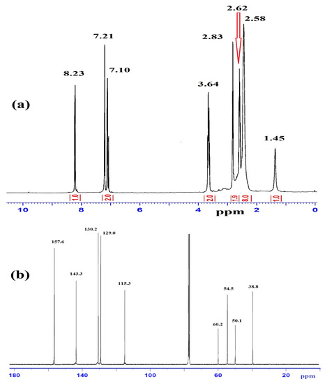 Experimental 1H NMR and 13C NMR analyses of the ligands were performed in CDCl3, as explained in the experimental section. The typical 1H-NMR and 13C NMR spectra of L3 are illustrated in Figure 1a,b, respectively. Figure 1a shows a sharp broad signal at δ 1.45 ppm that belongs to an NH piperazine proton; two broad peaks at 2.58 and 2.62 ppm were attributed to the 4CH2 of the piperazine ring. Two triplet signals at 2.83 and 3.64 ppm with JH-H = 6.0 Hz were cited to =NCH2CH2N and =NCH2CH2N, respectively. The thiophene protons were detected as two doublet signals at δ 7.01 and 7.21 ppm with JH-H = 8.0 Hz. The signal of the aldehyde proton at 10.50 ppm disappeared, confirming the formation of azomethineproton -N=CH, which was detected as a singlet at 8.23 ppm.