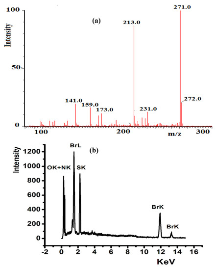 The compositions of L1–L3 were determined by EDS analysis, elemental analyses, and MS. The mass spectra of L1 (Figure 2a) exhibited a molecular ion peak [M]+, m/z at 271.0 (theoretical = 271.2). The results are consistent with the proposed molecular formula of each compound. The EDS analysis of L3, shown in Figure 2b, contained C, N, S, and Br; the absence of uncited peaks reflects the purity; the existence of no O atom signal reveals the stability of such compounds against atmospheric O2 pressure.