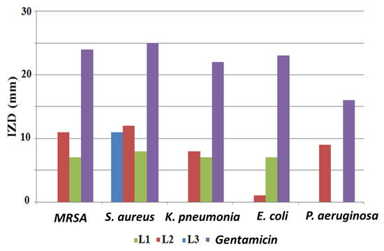 The three synthesized compounds were tested for their antibacterial activity using the disk diffusion method, and the obtained results are illustrated in Figure 8. Gentamicin was used as the standard antibiotic. It was observed that the examined compounds were not powerful antibacterial agents. The desired compounds were found to be antibacterial in the following order: L2 > L1 > L3. In spite of its low antibacterial behavior, L2 was active against all examined bacterial isolates. The most sensitive isolates to L2 were Gram-positive S. aureus and methicillin-resistant Staphylococcus aureus (MRSA), with inhibition zone diameters (IZDs) of 12 mm and 11 mm, respectively. In addition, the growth of P. aeruginosa was only inhibited by L2 (9 mm).