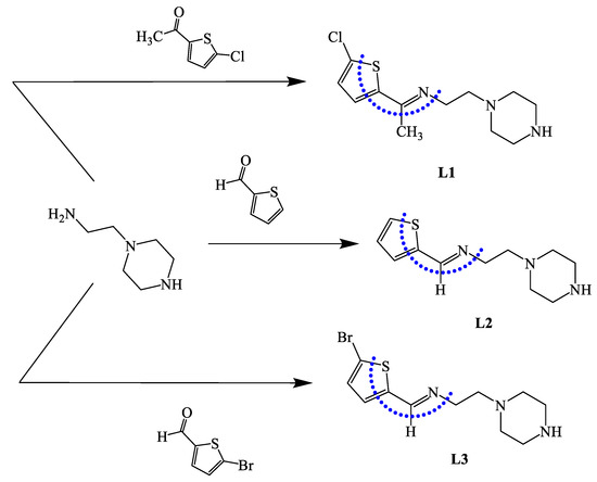 The desired Schiff bases were prepared by condensation of one mole of 2-(piperidin-4-yl) ethanamine with 1.2 mole of the corresponding aldehydes as: 1-(5-chlorothiophen-2-yl) thenone, thiophene-2-carbaldehyde, and 5-bromothiophene-2-carbaldehyde, which afforded the good yields formation of N-(1-(5-chlorothiophen-2-yl)ethylidene)-2-(piperazin-1-yl)ethanamine (L1), 2-(piperazin-1-yl)-N-(thiophen-2-ylmethylene)-ethanamine (L2), and N-((5-bromothiophen-2-yl)methylene)-2-(piperazin-1-yl)ethanamine (L3), respectively (Scheme 1). The synthesized ligands were found to be soluble in common organic solvents. NMR, MS, UV–Vis, FTIR, EA, EDS, and TG physical measurements were used to analyze the structures of the ligands. Theoretical DFT calculations were performed for L2 and compared to the corresponding experimental results.